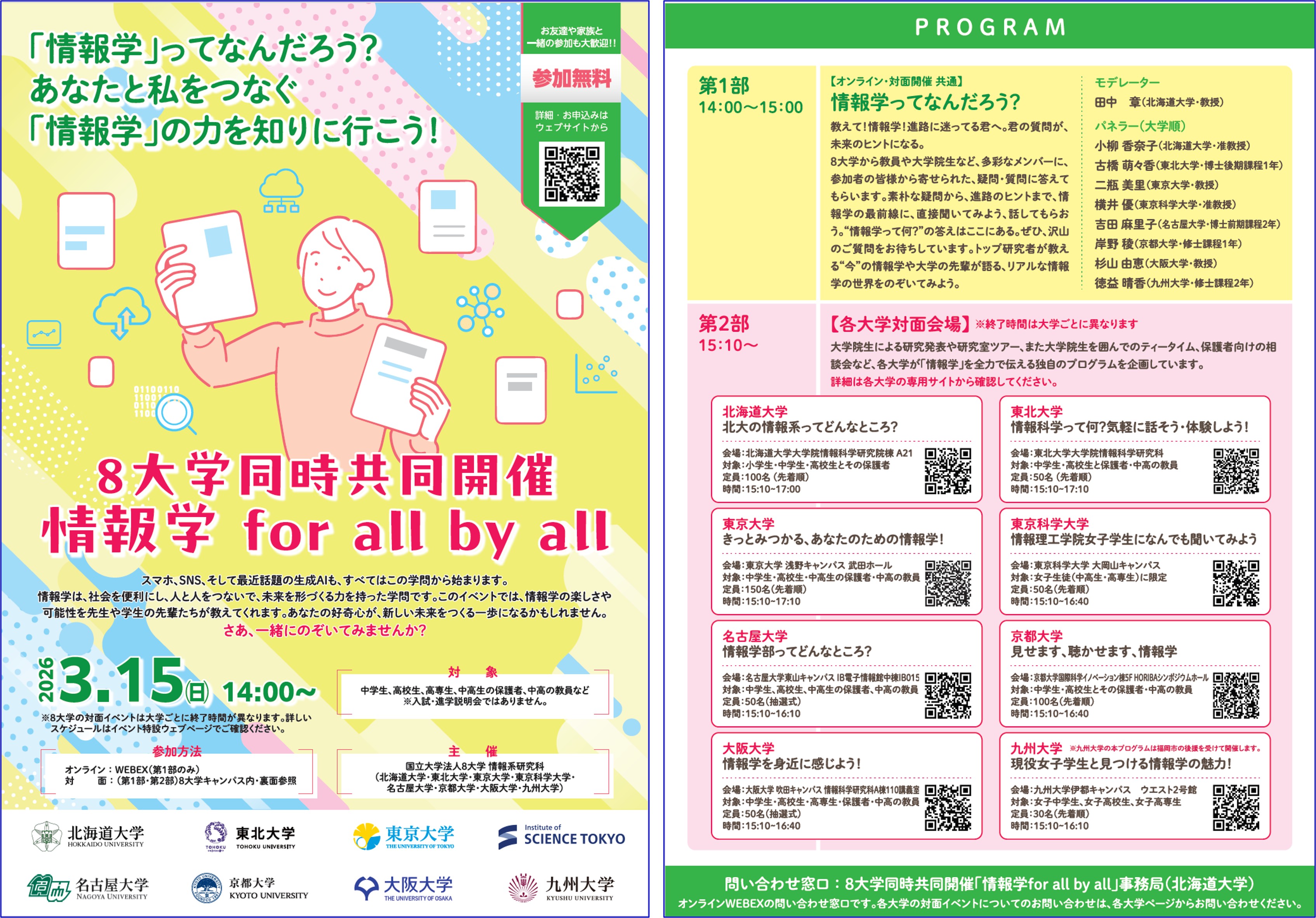 国立大学法人8大学(北海道大学・東北大学・東京大学・東京科学大学・名古屋大学・京都大学・大阪大学・九州大学)の情報系研究科は連携し、8大学同時共同開催 情報学 for all by all をオンラインと8大学キャンパス対面のハイブリッド方式で開催します。